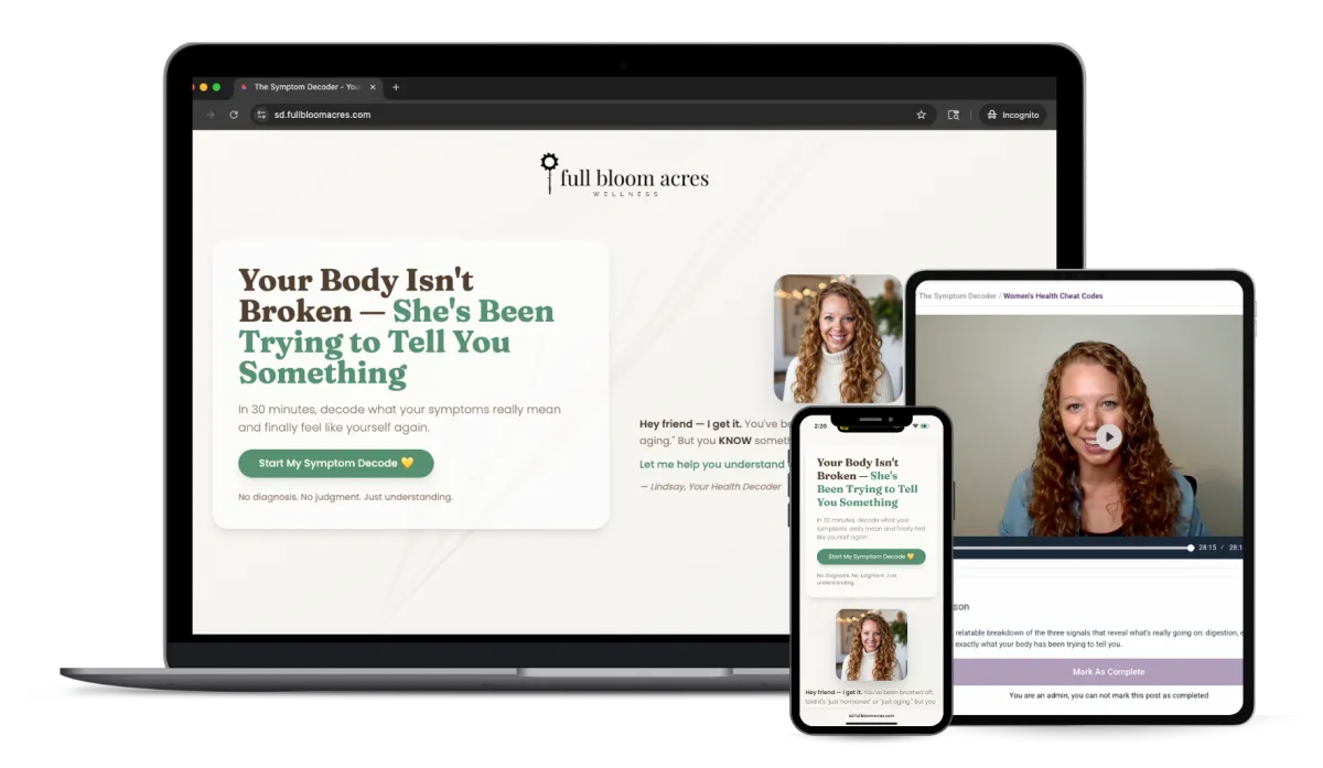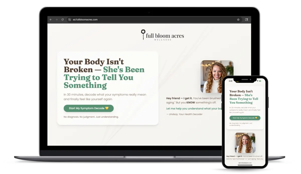 A: The Symptom Decoder isn’t another diet, supplement, or plan — it’s a clarity tool. You’ll walk away with a personalized profile that helps you understand what your body’s been trying to say, not another list of things to fix. Most women feel relief and validation immediately after going through it.